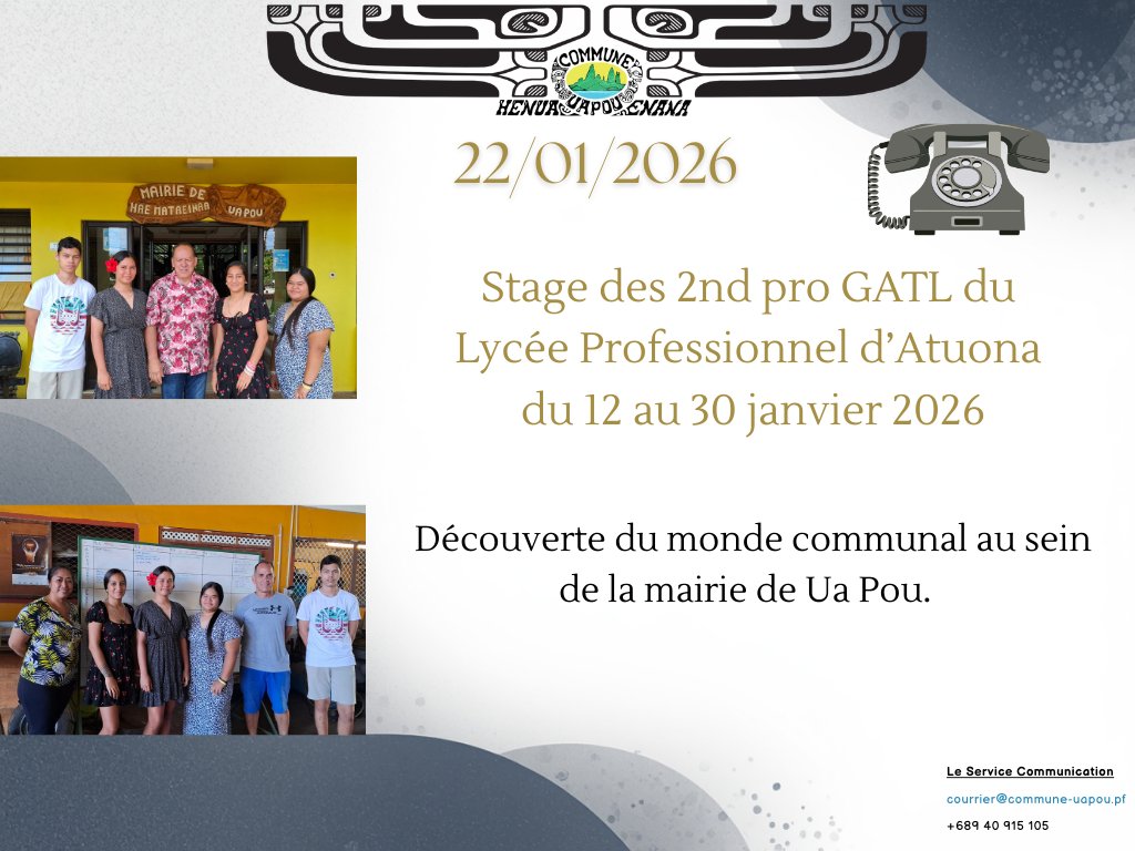 La commune de Ua Pou a le plaisir d’accueillir 4 stagiaires de 2nde professionnelle AGORA du lycée professionnel d’Atuona, venus découvrir le monde communal et le fonctionnement des services publics de proximité.