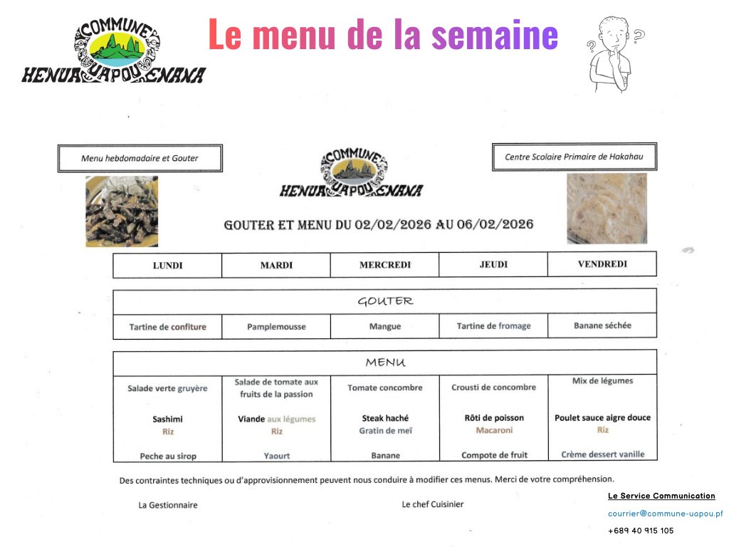 La commune de Ua Pou vous présente le menu des cantines de nos enfants pour cette première semaine du mois de février 2026.