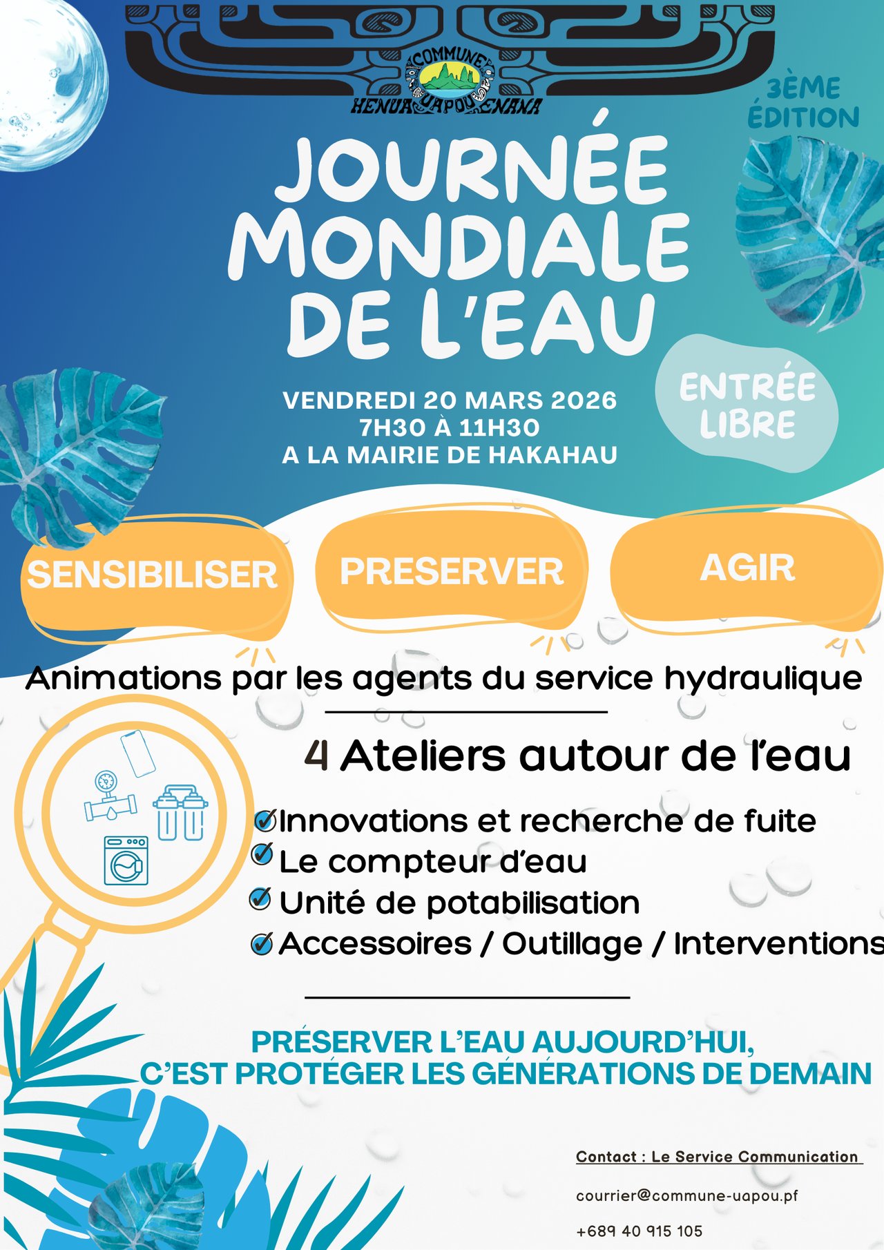 La Commune de Ua Pou vous invite à participer à la 3ème édition de la journée mondiale de l'eau animée par les agents du service hydraulique avec au programme :
